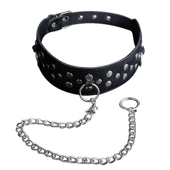 Кожаный чёрный ошейник с карабином и металлическим поводком-цепочкой. Ошейник сделан из натуральной кожи с мягкой велюровой подкладкой для более комфортного ношения. При изготовлении использована никелированная фурнитура. Размер универсальный.